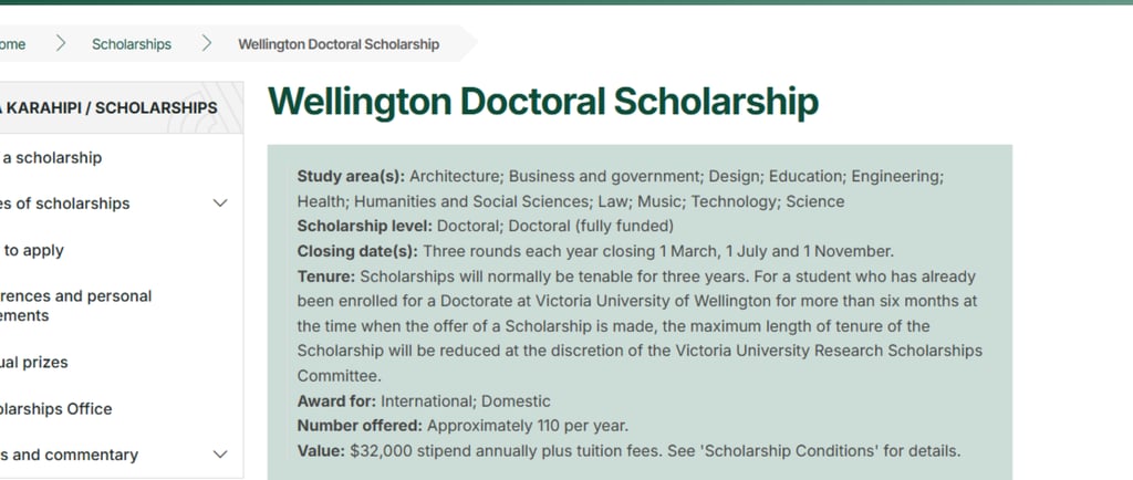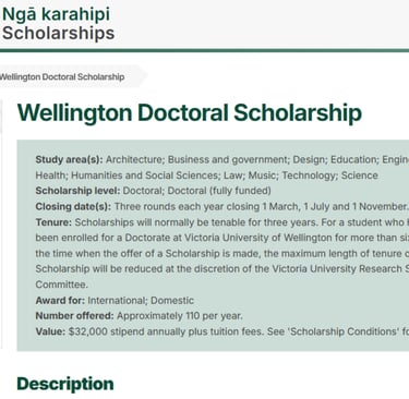 Apply for the Wellington Doctoral Scholarships 2026 in New Zealand. Fully funded PhD with NZD $32,000 stipend + tuition fees at Victoria University of Wellington.